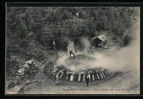 AK Sächs.-Böhm. Schweiz, Köhler steht auf dem Meiler