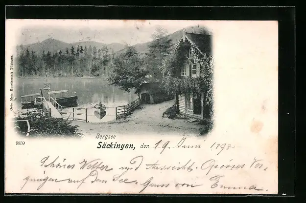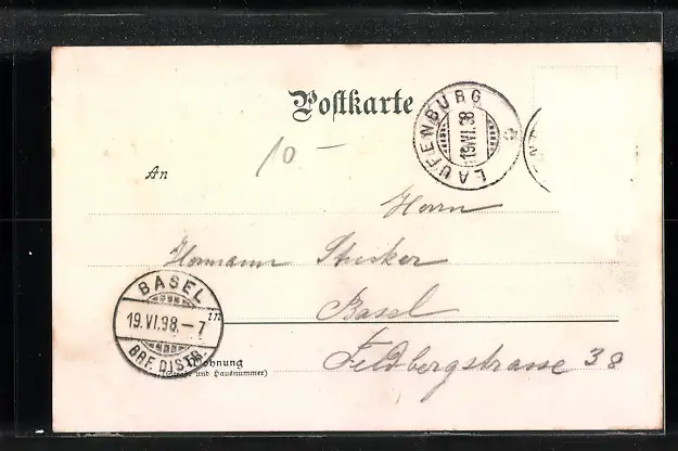 alte Ansichtskarte, gelaufen 1898, Briefmarke entfernt, rückseitig Oberflächenschaden, Bugspuren mittig, leicht fleckig