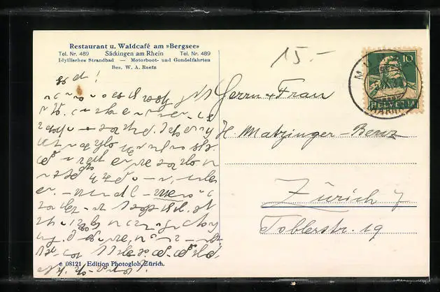 Personenbezogene Daten auf der Rückseite der Karte wurden durch blauen Textmarker unkenntlich gemacht. Die blauen Stellen sind auf die Vorderseite durchgeweicht und wirken sich negativ auf das Postkartenfoto aus