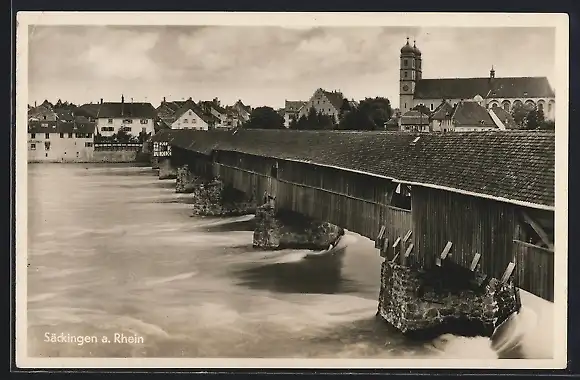 AK Säckingen am Rhein, Rheinbrücke mit Kirche