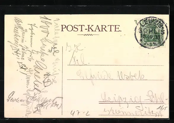Personenbezogene Daten auf der Rückseite der Karte wurden durch blauen Textmarker unkenntlich gemacht. Die blauen Stellen sind auf die Vorderseite durchgeweicht und wirken sich negativ auf das Postkartenfoto aus