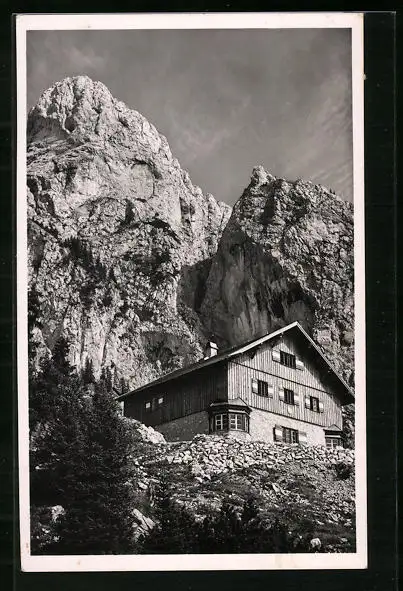 AK Säulinghaus, Berghütte vor Felsmassiv mit Säuling