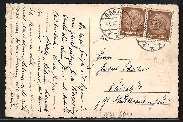 gelaufen 1936, Eckknicke li. oben und re. unten, Bugspur oben li., guter Zustand