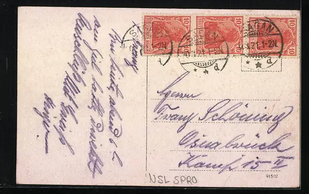 alte Ansichtskarte, gelaufen 1921, Eckknick li. oben, Oberflächenschaden, Bugspur li. unten, guter Zustand