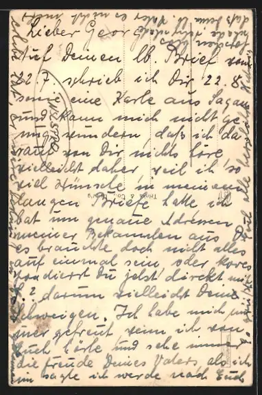 Personenbezogene Daten auf der Rückseite der Karte wurden durch blauen Textmarker unkenntlich gemacht. Die blauen Stellen sind auf die Vorderseite durchgeweicht und wirken sich negativ auf das Postkartenfoto aus