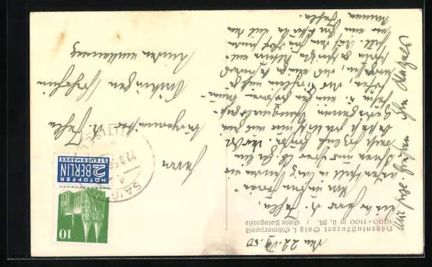 Personenbezogene Daten auf der Rückseite der Karte wurden durch blauen Textmarker unkenntlich gemacht. Die blauen Stellen sind auf die Vorderseite durchgeweicht und wirken sich negativ auf das Postkartenfoto aus