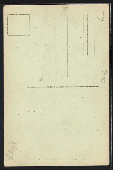 Personenbezogene Daten auf der Rückseite der Karte wurden durch blauen Textmarker unkenntlich gemacht. Die blauen Stellen sind auf die Vorderseite durchgeweicht und wirken sich negativ auf das Postkartenfoto aus