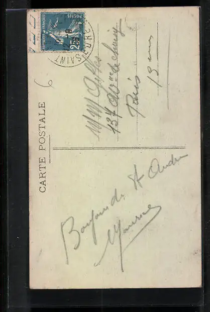 Personenbezogene Daten auf der Rückseite der Karte wurden durch blauen Textmarker unkenntlich gemacht. Die blauen Stellen sind auf die Vorderseite durchgeweicht und wirken sich negativ auf das Postkartenfoto aus