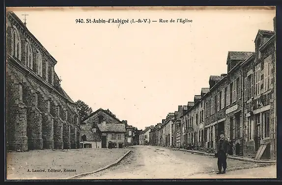 AK Saint-Aubin-d`Aubigné, Rue de l`Église avec bâtiments en pierre et rangée de maisons