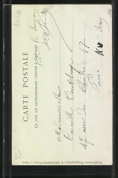 Personenbezogene Daten auf der Rückseite der Karte wurden durch blauen Textmarker unkenntlich gemacht. Die blauen Stellen sind auf die Vorderseite durchgeweicht und wirken sich negativ auf das Postkartenfoto aus