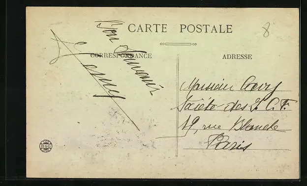 Personenbezogene Daten auf der Rückseite der Karte wurden durch blauen Textmarker unkenntlich gemacht. Die blauen Stellen sind auf die Vorderseite durchgeweicht und wirken sich negativ auf das Postkartenfoto aus