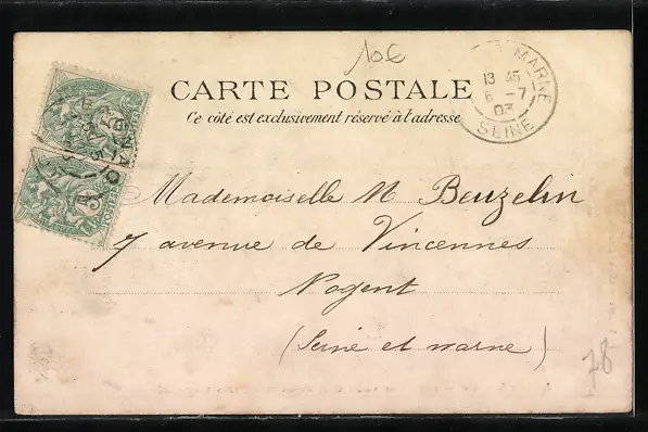 Personenbezogene Daten auf der Rückseite der Karte wurden durch blauen Textmarker unkenntlich gemacht. Die blauen Stellen sind auf die Vorderseite durchgeweicht und wirken sich negativ auf das Postkartenfoto aus