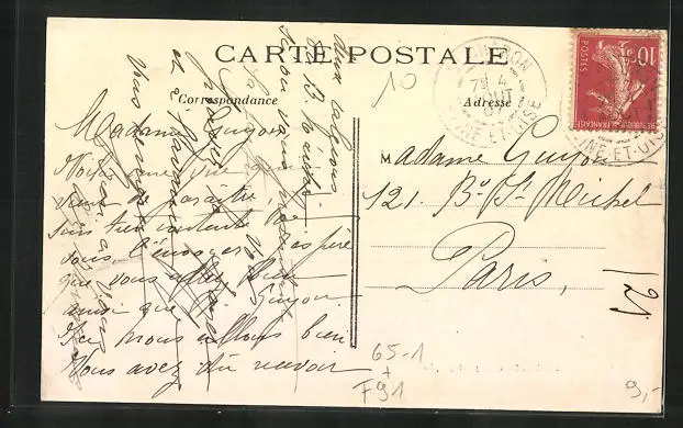 Personenbezogene Daten auf der Rückseite der Karte wurden durch blauen Textmarker unkenntlich gemacht. Die blauen Stellen sind auf die Vorderseite durchgeweicht und wirken sich negativ auf das Postkartenfoto aus