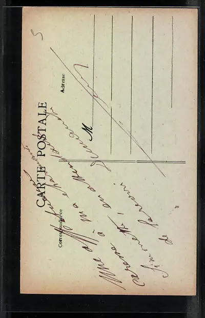 Personenbezogene Daten auf der Rückseite der Karte wurden durch blauen Textmarker unkenntlich gemacht. Die blauen Stellen sind auf die Vorderseite durchgeweicht und wirken sich negativ auf das Postkartenfoto aus