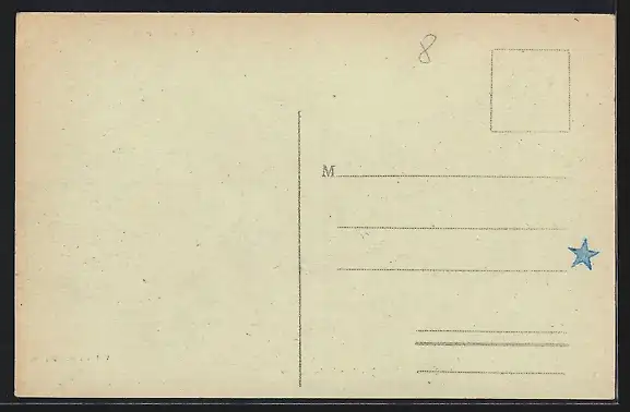 Personenbezogene Daten auf der Rückseite der Karte wurden durch blauen Textmarker unkenntlich gemacht. Die blauen Stellen sind auf die Vorderseite durchgeweicht und wirken sich negativ auf das Postkartenfoto aus