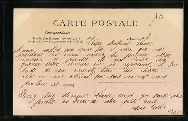 Personenbezogene Daten auf der Rückseite der Karte wurden durch blauen Textmarker unkenntlich gemacht. Die blauen Stellen sind auf die Vorderseite durchgeweicht und wirken sich negativ auf das Postkartenfoto aus