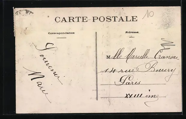 Personenbezogene Daten auf der Rückseite der Karte wurden durch blauen Textmarker unkenntlich gemacht. Die blauen Stellen sind auf die Vorderseite durchgeweicht und wirken sich negativ auf das Postkartenfoto aus