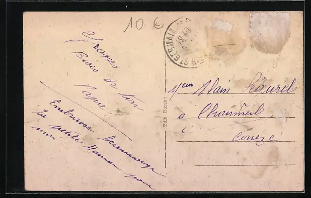 Personenbezogene Daten auf der Rückseite der Karte wurden durch blauen Textmarker unkenntlich gemacht. Die blauen Stellen sind auf die Vorderseite durchgeweicht und wirken sich negativ auf das Postkartenfoto aus