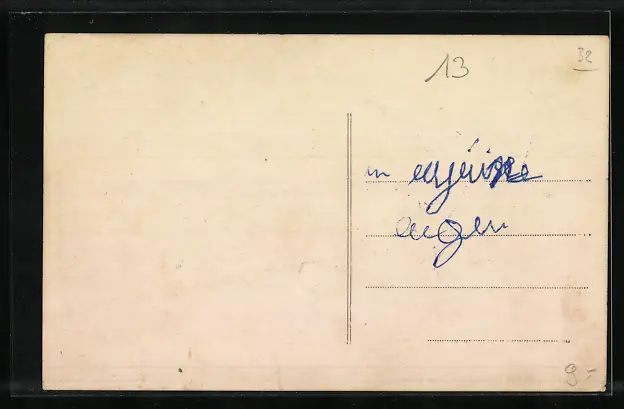 Personenbezogene Daten auf der Rückseite der Karte wurden durch blauen Textmarker unkenntlich gemacht. Die blauen Stellen sind auf die Vorderseite durchgeweicht und wirken sich negativ auf das Postkartenfoto aus