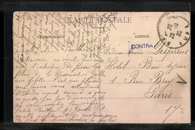 Personenbezogene Daten auf der Rückseite der Karte wurden durch blauen Textmarker unkenntlich gemacht. Die blauen Stellen sind auf die Vorderseite durchgeweicht und wirken sich negativ auf das Postkartenfoto aus