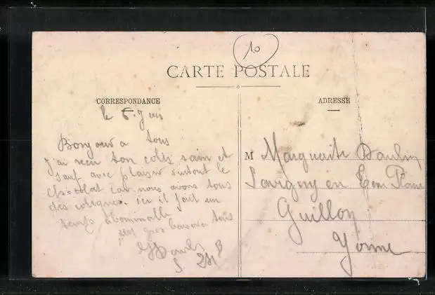 Personenbezogene Daten auf der Rückseite der Karte wurden durch blauen Textmarker unkenntlich gemacht. Die blauen Stellen sind auf die Vorderseite durchgeweicht und wirken sich negativ auf das Postkartenfoto aus