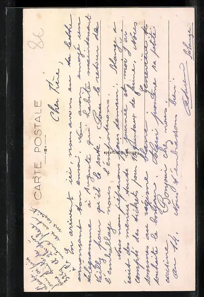 Personenbezogene Daten auf der Rückseite der Karte wurden durch blauen Textmarker unkenntlich gemacht. Die blauen Stellen sind auf die Vorderseite durchgeweicht und wirken sich negativ auf das Postkartenfoto aus