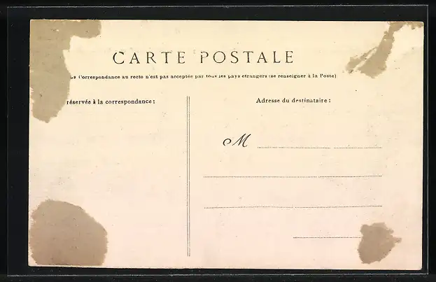 Personenbezogene Daten auf der Rückseite der Karte wurden durch blauen Textmarker unkenntlich gemacht. Die blauen Stellen sind auf die Vorderseite durchgeweicht und wirken sich negativ auf das Postkartenfoto aus