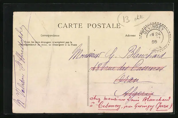 Personenbezogene Daten auf der Rückseite der Karte wurden durch blauen Textmarker unkenntlich gemacht. Die blauen Stellen sind auf die Vorderseite durchgeweicht und wirken sich negativ auf das Postkartenfoto aus