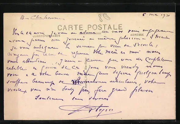 Personenbezogene Daten auf der Rückseite der Karte wurden durch blauen Textmarker unkenntlich gemacht. Die blauen Stellen sind auf die Vorderseite durchgeweicht und wirken sich negativ auf das Postkartenfoto aus