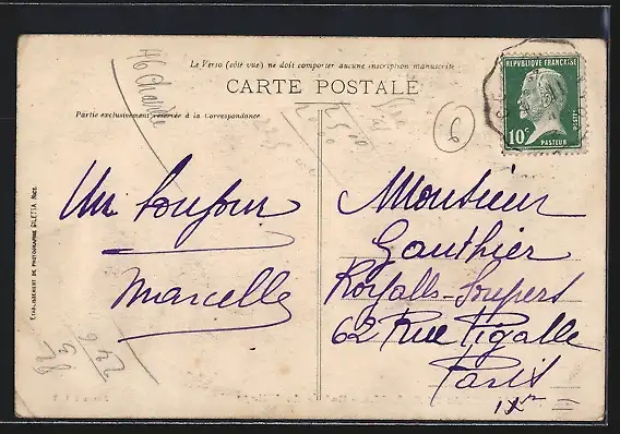 Personenbezogene Daten auf der Rückseite der Karte wurden durch blauen Textmarker unkenntlich gemacht. Die blauen Stellen sind auf die Vorderseite durchgeweicht und wirken sich negativ auf das Postkartenfoto aus