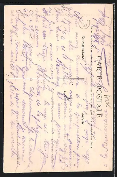 Personenbezogene Daten auf der Rückseite der Karte wurden durch blauen Textmarker unkenntlich gemacht. Die blauen Stellen sind auf die Vorderseite durchgeweicht und wirken sich negativ auf das Postkartenfoto aus