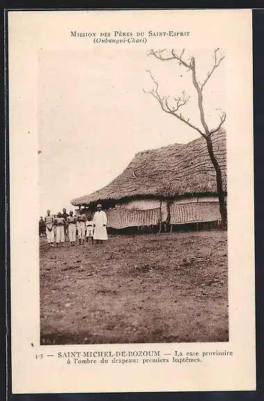 AK Saint-Michel-de-Bozoum, La case provisoire à l`ombre du drapeau: premiers baptêmes