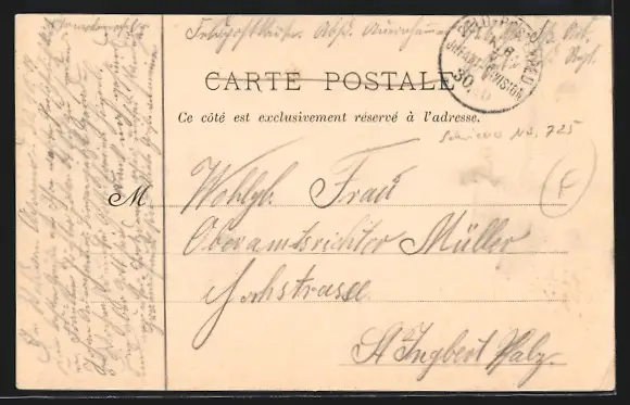 Personenbezogene Daten auf der Rückseite der Karte wurden durch blauen Textmarker unkenntlich gemacht. Die blauen Stellen sind auf die Vorderseite durchgeweicht und wirken sich negativ auf das Postkartenfoto aus