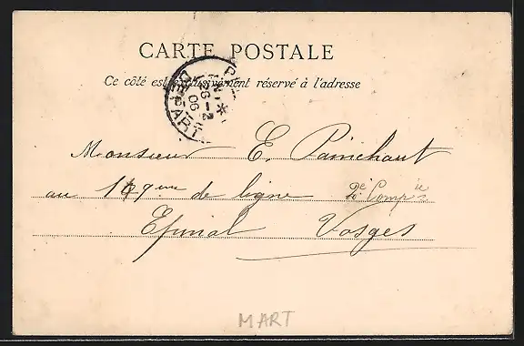 Personenbezogene Daten auf der Rückseite der Karte wurden durch blauen Textmarker unkenntlich gemacht. Die blauen Stellen sind auf die Vorderseite durchgeweicht und wirken sich negativ auf das Postkartenfoto aus