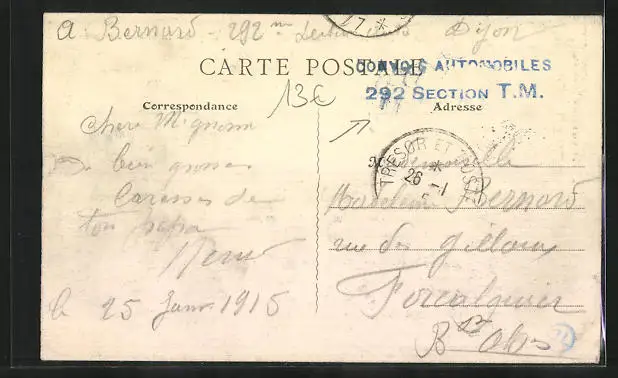Personenbezogene Daten auf der Rückseite der Karte wurden durch blauen Textmarker unkenntlich gemacht. Die blauen Stellen sind auf die Vorderseite durchgeweicht und wirken sich negativ auf das Postkartenfoto aus