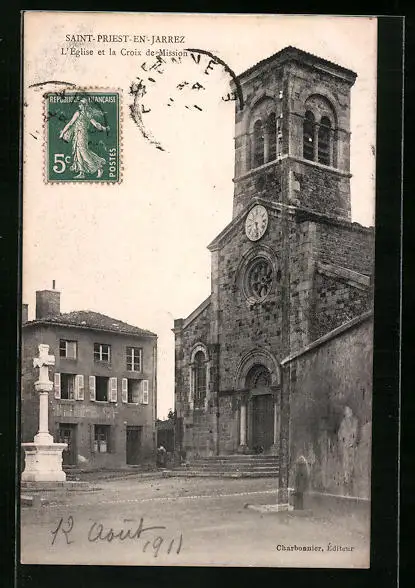 AK Saint-Priest-en-Jarrez, l'Église et la Croix de Mission