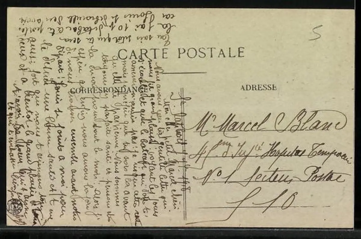 Personenbezogene Daten auf der Rückseite der Karte wurden durch blauen Textmarker unkenntlich gemacht. Die blauen Stellen sind auf die Vorderseite durchgeweicht und wirken sich negativ auf das Postkartenfoto aus