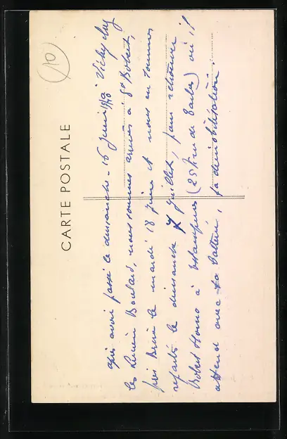 Personenbezogene Daten auf der Rückseite der Karte wurden durch blauen Textmarker unkenntlich gemacht. Die blauen Stellen sind auf die Vorderseite durchgeweicht und wirken sich negativ auf das Postkartenfoto aus