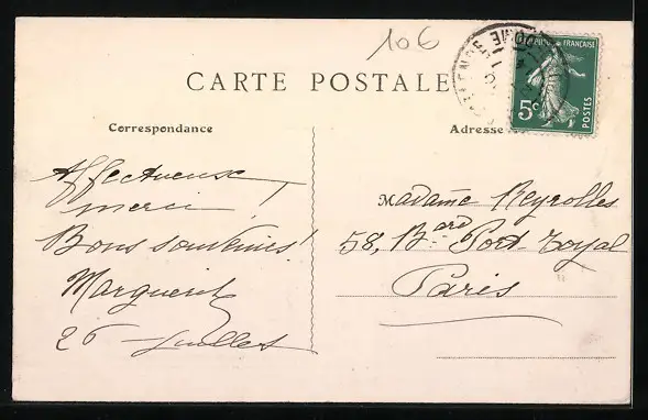 Personenbezogene Daten auf der Rückseite der Karte wurden durch blauen Textmarker unkenntlich gemacht. Die blauen Stellen sind auf die Vorderseite durchgeweicht und wirken sich negativ auf das Postkartenfoto aus