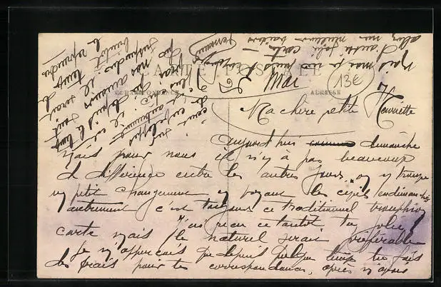 Personenbezogene Daten auf der Rückseite der Karte wurden durch blauen Textmarker unkenntlich gemacht. Die blauen Stellen sind auf die Vorderseite durchgeweicht und wirken sich negativ auf das Postkartenfoto aus