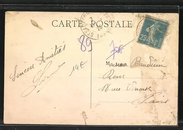 Personenbezogene Daten auf der Rückseite der Karte wurden durch blauen Textmarker unkenntlich gemacht. Die blauen Stellen sind auf die Vorderseite durchgeweicht und wirken sich negativ auf das Postkartenfoto aus