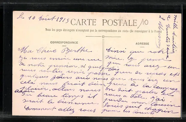Personenbezogene Daten auf der Rückseite der Karte wurden durch blauen Textmarker unkenntlich gemacht. Die blauen Stellen sind auf die Vorderseite durchgeweicht und wirken sich negativ auf das Postkartenfoto aus