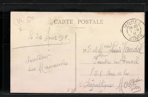 Personenbezogene Daten auf der Rückseite der Karte wurden durch blauen Textmarker unkenntlich gemacht. Die blauen Stellen sind auf die Vorderseite durchgeweicht und wirken sich negativ auf das Postkartenfoto aus