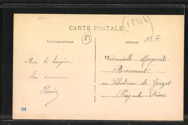 Personenbezogene Daten auf der Rückseite der Karte wurden durch blauen Textmarker unkenntlich gemacht. Die blauen Stellen sind auf die Vorderseite durchgeweicht und wirken sich negativ auf das Postkartenfoto aus