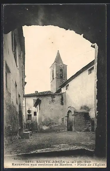 AK Sainte-Agnès, Place de l`Église et vue du clocher