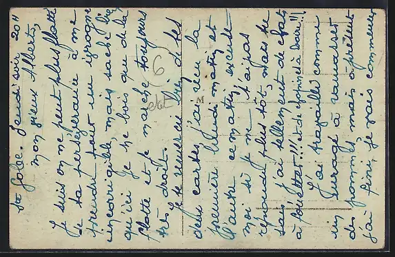 Personenbezogene Daten auf der Rückseite der Karte wurden durch blauen Textmarker unkenntlich gemacht. Die blauen Stellen sind auf die Vorderseite durchgeweicht und wirken sich negativ auf das Postkartenfoto aus