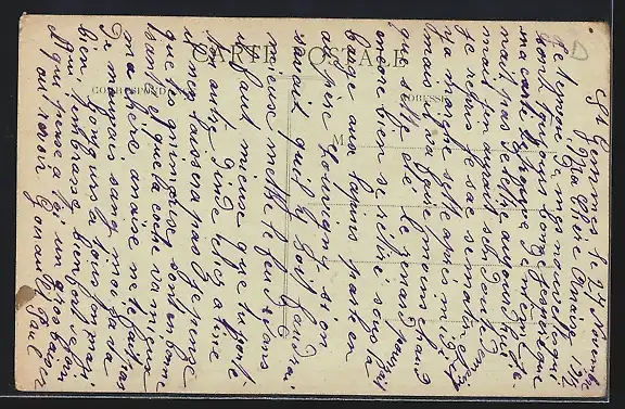 Personenbezogene Daten auf der Rückseite der Karte wurden durch blauen Textmarker unkenntlich gemacht. Die blauen Stellen sind auf die Vorderseite durchgeweicht und wirken sich negativ auf das Postkartenfoto aus