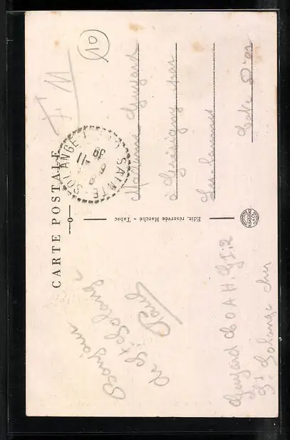 Personenbezogene Daten auf der Rückseite der Karte wurden durch blauen Textmarker unkenntlich gemacht. Die blauen Stellen sind auf die Vorderseite durchgeweicht und wirken sich negativ auf das Postkartenfoto aus