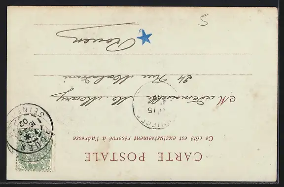 Personenbezogene Daten auf der Rückseite der Karte wurden durch blauen Textmarker unkenntlich gemacht. Die blauen Stellen sind auf die Vorderseite durchgeweicht und wirken sich negativ auf das Postkartenfoto aus