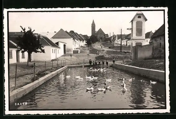AK Saitz /Nieder-Donau, Ortspartie mit Ententeich